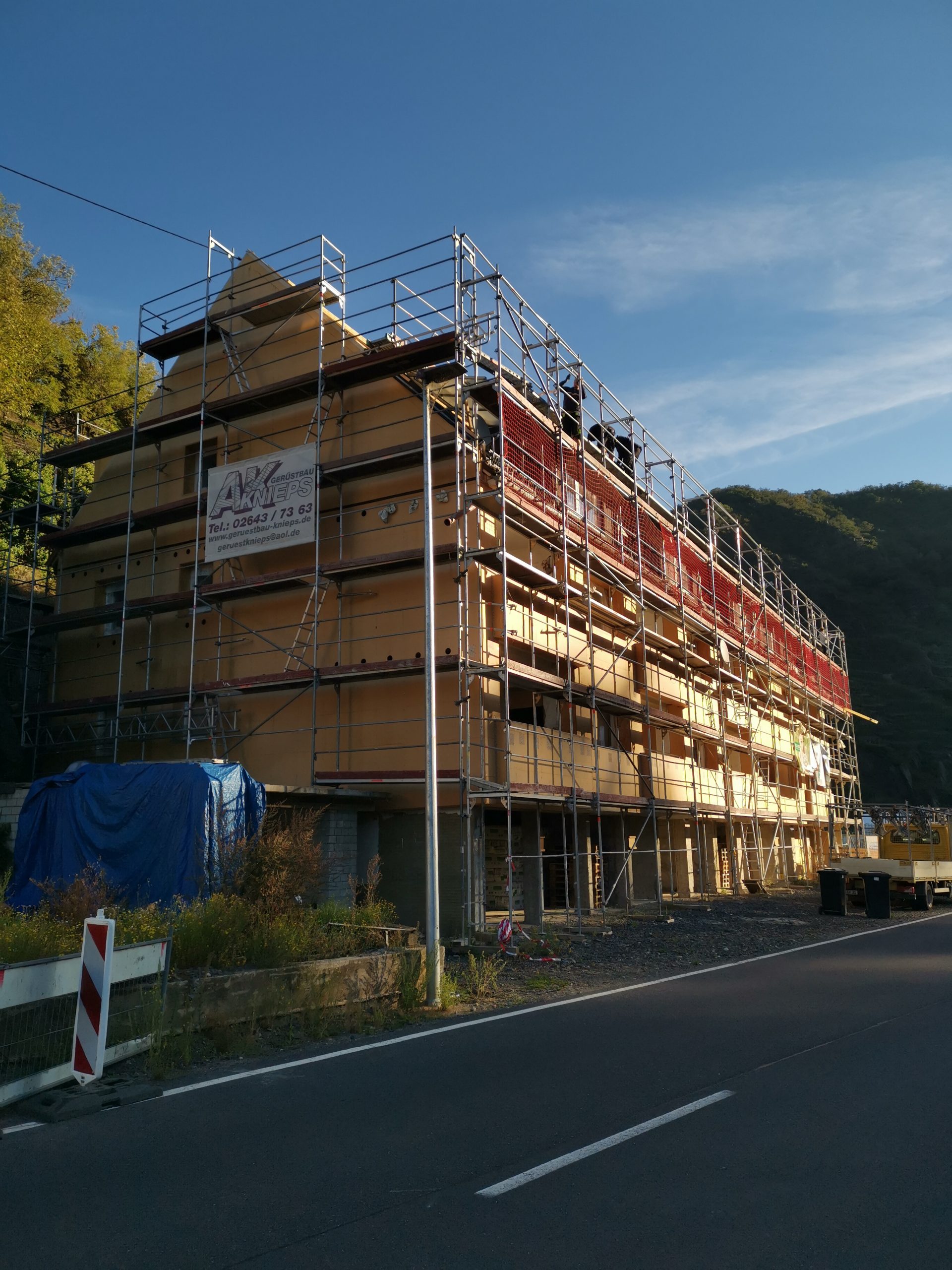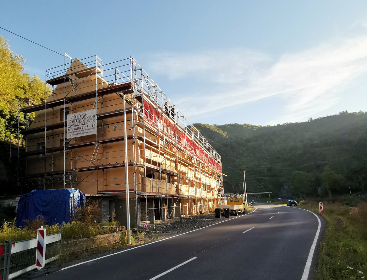 Das Ahrwasser 2021 erreichte das 2. Obergeschoss des 4-Geschossers in Mayschoß. Nun wird das Gebäude zukunftsfähig wieder aufgebaut – energetisch und ökologisch.