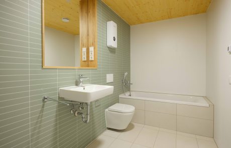 Möglich wird dies durch konsequente und durchdachte Planung und serielle Holzbauweise, die auch vorgefertigte Balkone und Bäder inkludiert: